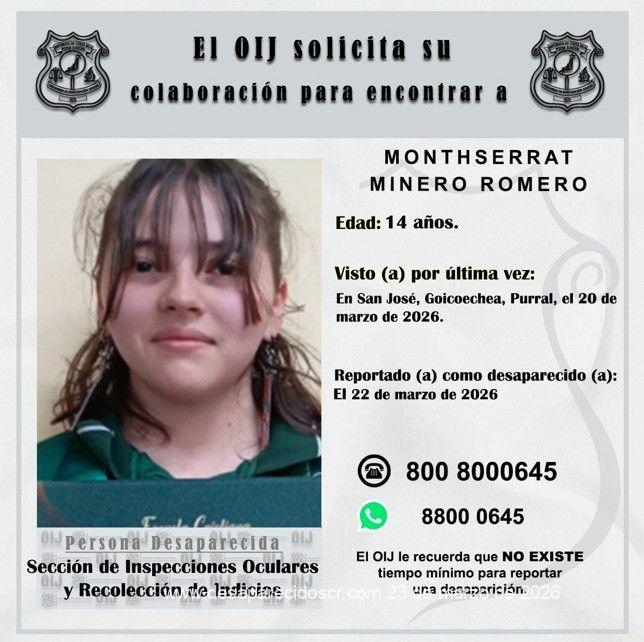 La Sección de Inspecciones Oculares y Recolección de Indicios del Organismo de Investigación Judicial requiere la colaboración de la ciudadanía para ubicar a Monthserrat Minero Romero, de 14 años, quien fue reportada como desaparecida el 22 de marzo de 2026, fue vista por última vez en San José, Goicoechea, Purral, el 20 de marzo de 2026. Cualquier información que pueda brindar es indispensable que se comunique al teléfono 800-8000645 o al WhatsApp 8800-0645 del Centro de Información Confidencial.