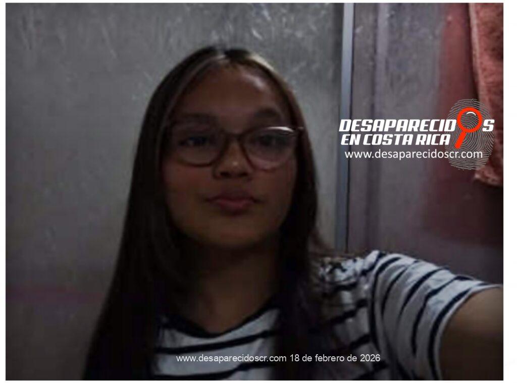 La Sección de Inspecciones Oculares y Recolección de Indicios del Organismo de Investigación Judicial requiere la colaboración de la ciudadanía para ubicar a EVANGELINE CHACÓN ÁLVAREZ, de 14 años, quien fue reportada como desaparecida el 17 de febrero de 2026, fue vista por última vez en San José, Pavas, Villa Esperanza, el 17 de febrero de 2026. Cualquier información que pueda brindar es indispensable que se comunique al teléfono 800-8000645 o al WhatsApp 8800-0645 del Centro de Información Confidencial.