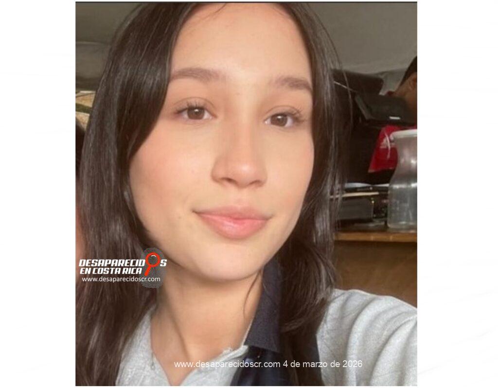 La Sección de Inspecciones Oculares y Recolección de Indicios del Organismo de Investigación Judicial requiere la colaboración de la ciudadanía para ubicar a JIMENA GUILLÉN CALVO, de 15 años, quien fue reportada como desaparecida el 03 de marzo de 2026, fue vista por última vez en San José, Goicoechea, Guadalupe, el 03 de marzo de 2026. Cualquier información que pueda brindar es indispensable que se comunique al teléfono 800-8000645 o al WhatsApp 8800-0645 del Centro de Información Confidencial.