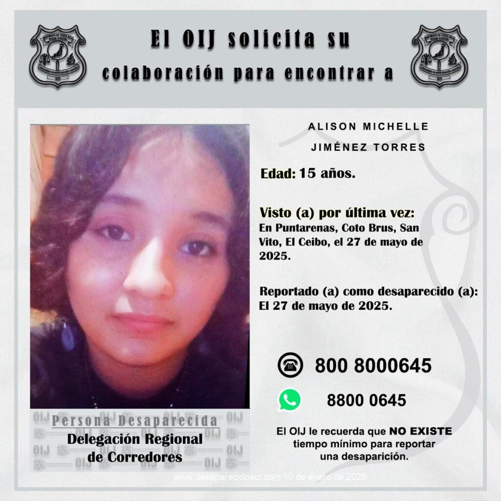 La Delegación Regional de Corredores del Organismo de Investigación Judicial requiere la colaboración de la ciudadanía para ubicar a ALISON MICHELLE JIMÉNEZ TORRES, de 15 años, quien fue reportada como desaparecida el 27 de mayo de 2025, fue vista por última vez en Puntarenas, Coto Brus, San Vito, El Ceibo, el 27 de mayo de 2025. Cualquier información que pueda brindar es indispensable que se comunique al teléfono 800-8000645 o al WhatsApp 8800-0645 del Centro de Información Confidencial.