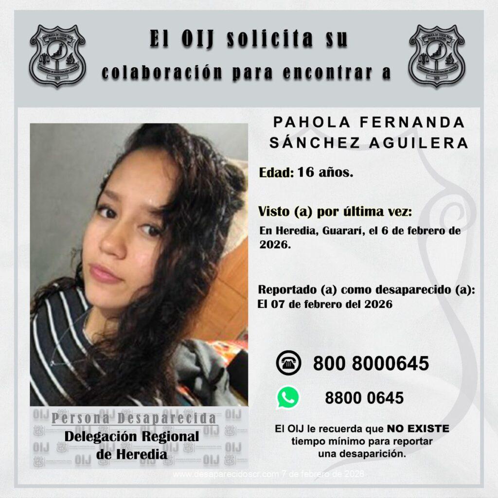 La Delegación Regional de Heredia del Organismo de Investigación Judicial requiere la colaboración de la ciudadanía para ubicar a PAHOLA FERNANDA SÁNCHEZ AGUILERA, de 16 años, quien fue reportada como desaparecida el 07 de febrero de 2026, fue vista por última vez en Heredia, Guararí, el 6 de febrero de 2026. Cualquier información que pueda brindar es indispensable que se comunique al teléfono 800-8000645 o al WhatsApp 8800-0645 del Centro de Información Confidencial.