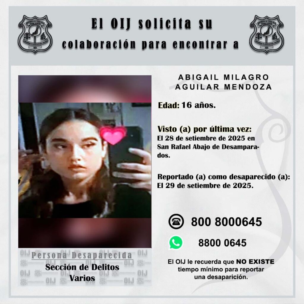La Sección de Delitos Varios del Organismo de Investigación Judicial (OIJ), requiere la colaboración de la ciudadanía para ubicar a ABIGAIL MILAGRO AGUILAR MENDOZA, de 16 años, quien fue reportada como desaparecida el 29 de setiembre de 2025, fue vista por última vez en San Rafael Abajo de Desamparados, el 28 de setiembre de 2025.