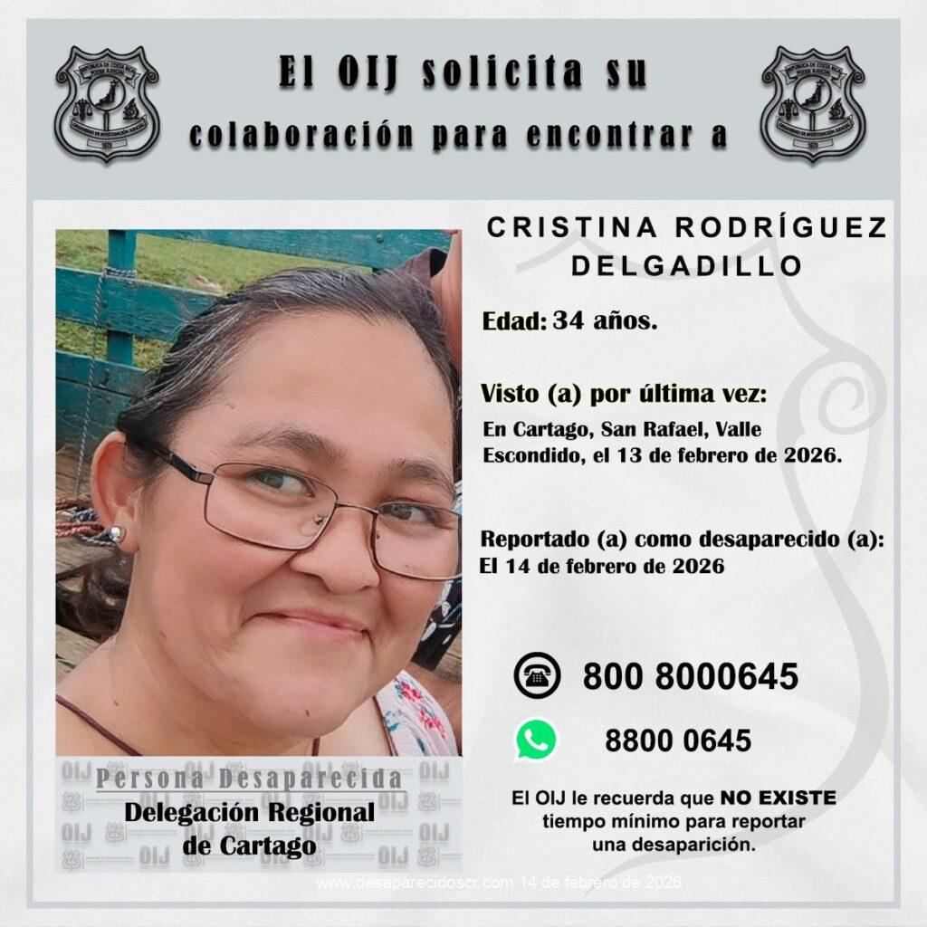 La Delegación Regional de Cartago del Organismo de Investigación Judicial requiere la colaboración de la ciudadanía para ubicar a CRISTINA RODRÍGUEZ DELGADILLO, de nacionalidad mexicana, de 34 años, quien fue reportada como desaparecida el 14 de febrero de 2026, fue vista por última vez en Cartago, San Rafael, Valle Escondido, el 13 de febrero de 2026. Cualquier información que pueda brindar es indispensable que se comunique al teléfono 800-8000645 o al WhatsApp 8800-0645 del Centro de Información Confidencial.